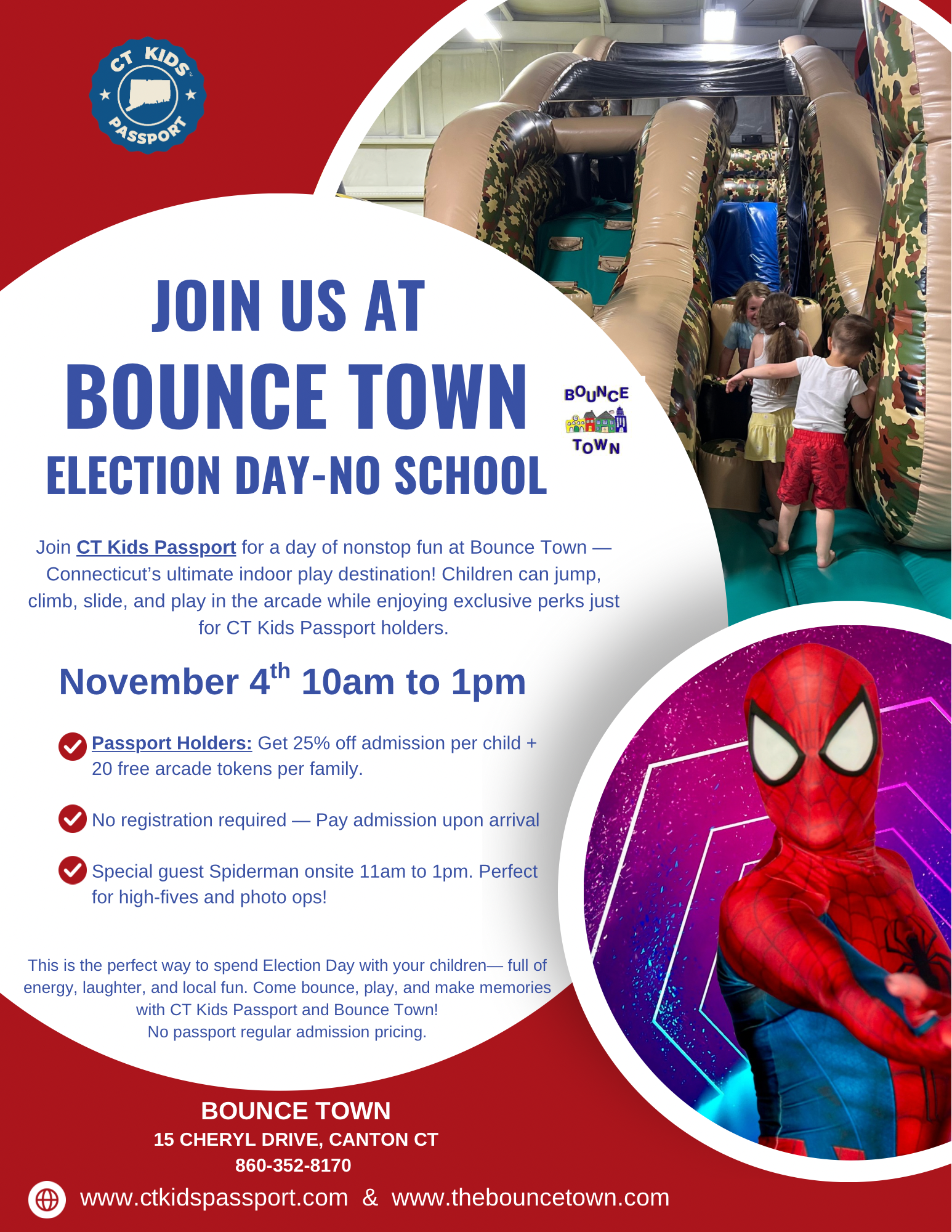 Are you ready to bounce your way to adventure? Earn your stamp with us on November 4th (Election Day). CT Kids Passport will be on site selling passports as well as enjoying the fun!
